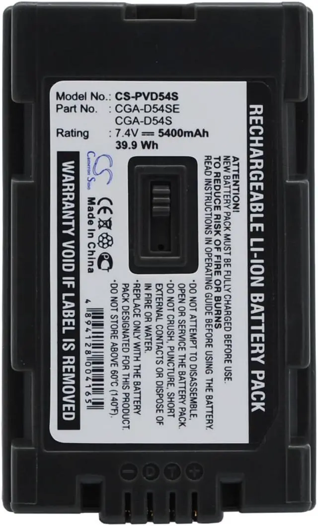 Battery for Panasonic AG-AC-90 AG-DVC180A AG-DVC30 AG-DVC30E AG-DVC32 AG-DVC33 Compatible with the following devices AG-AC-90, AG-DVC180A, AG-DVC30, AG-DVC30E, AG-DVC32, AG-DVC33, AG-DVC60, AG-DVC60E, AG-DVC62, AG-DVC63, AG-DVC80, AG-DVX100, AG-DVX100A, AG-DVX100AE, AG-DVX100AP, AG-DVX100B, AG-DVX100BE, AG-DVX100BP, AG-DVX100E, AG-DVX102A, AG-DVX102B, AG-HVX200, AG-HVX200P, AJ-PCS060G(Portable Hard Disk, NV-DS29, NV-DS29EG, NV-DS30, NV-DS30A, NV-DS30EG, NV-DS50A, NV-GX7, NV-GX7K, NV-MX1000, NV-MX2500, NV-MX350, NV-MX350A, NV-MX350B, NV-MX350EN, NV-MX5, NV-MX500, NV-MX5000, NV-MX500EG, NV-MX500EN Compatible with Battery Part Numbers CGA-D54, CGA-D54S, CGA-D54SE, CGA-D54SE/1B, CGA-D54SE/1H, CGP-D54S, CGR-D54S, VW-VBD55