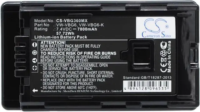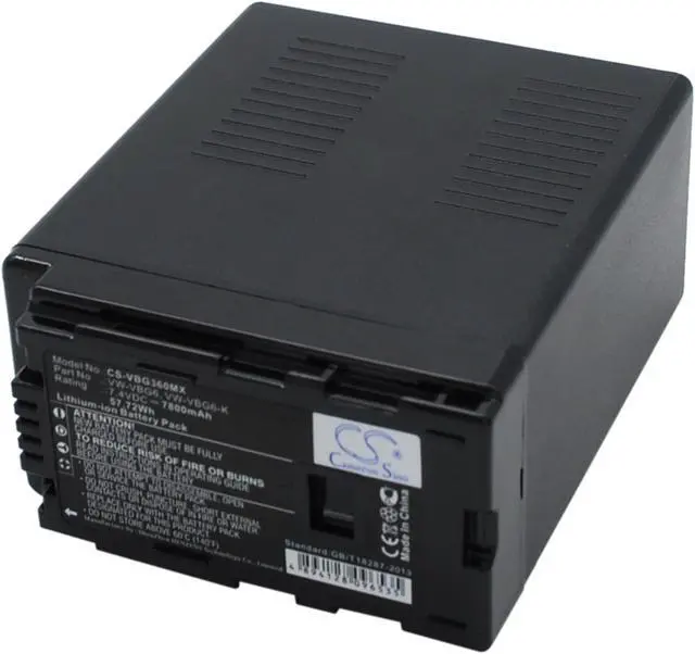 Battery for Panasonic AG-AC130 AG-AC130A AG-AC130AEJ AG-AC130AP AG-AC160 Compatible with the following devices AG-AC130, AG-AC130A, AG-AC130AEJ, AG-AC130AP, AG-AC160, AG-AC160A, AG-AC160AEJ, AG-AC160AP, AG-HMC150, AG-HMC153MC, AG-HMC40, AG-HMC70, AG-HMR10, AG-HMR10A, AG-HMR10E, AG-HMR10P, AG-HSC1U, CGA-E625, HDC-DX1, HDC-DX1EG-S, HDC-DX1GK, HDC-DX1-S, HDC-DX3, HDC-HS100, HDC-HS100GK, HDC-HS20, HDC-HS200, HDC-HS250, HDC-HS300, HDC-HS350, HDC-HS700, HDC-HS700K, HDC-HS9, HDC-HS9EG-S, HDC-HS9GK, HDC-MDH1GK, HDC-SD1, HDC-SD10, HDC-SD100, HDC-SD100GK, HDC-SD1-S, HDC-SD20, HDC-SD200, HDC-SD3, HDC-SD5, HDC-SD5EG-K, HDC-SD5EG-S, HDC-SD5GC-K, HDC-SD5GK, HDC-SD600, HDC-SD7, HDC-SD700, HDC-SD707, HDC-SD8K, HDC-SD9, HDC-SD9EG-K, HDC-SD9EG-S, HDC-SD9GK, HDC-SDT750, HDC-SDT750K, HDC-SX5, HDC-SX5EB-S, HDC-SX5EG-S, HDC-SX5GCS-S, HDC-SX5GK, HDC-TM10, HDC-TM10S, HDC-TM20, HDC-TM200, HDC-TM30, HDC-TM300, HDC-TM350, HDC-TM650, HDC-TM700, HDC-TM700K, HDC-TM750, NV-GS90, NV-GS98GK, PV-GS320, PV-GS500, PV-GS90, SDR-H258GK, SDR-H48GK, SDR-H50, SDR-H60, SDR-H68GK, SDR-H80, SDR-H80P, SDR-H80PC, SDR-H80S, SDR-H90, SDR-H90P, SDR-H90PC, VDR-D310, VDR-D50, VDR-D58GK Compatible with Battery Part Numbers VW-VBG6, VW-VBG6GK, VW-VBG6-K, VW-VBG6PPK