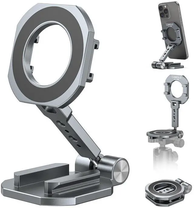Free Adjustment Phone Holder The design of 2 tilt axes and one ball head mount allows this magnetic Phone Holder to be adjusted in multiple dimensions, including any angle and proper height. It can easily switch between horizontal and vertical screens of the mobile phone, satisfying your diverse needs such as watching TV shows, watching videos, phone photography, phone video,making video calls, and reading