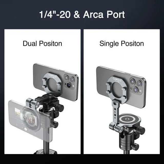 1/4"-20 & Arca Phone Tripod Mount This tripod phone holder has 1/4" screw hole, Arca port & cold shoe that is compatible with tripods, selfie lights, fill lights, and ring lights, making installation quick and easy. Just tighten the tripod phone magnetic bracket to the screw, and you're good to go