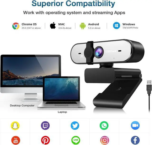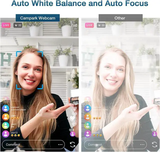 CAMPARK 2K webcam with auto focus lens, automatic white light and exposure correction, this HD webcam can show details clearly and stream clear video even in different light conditions.