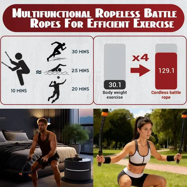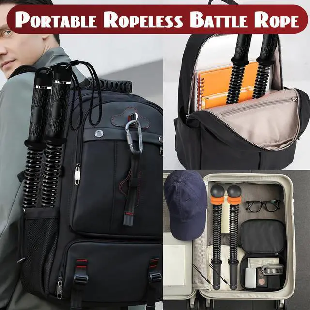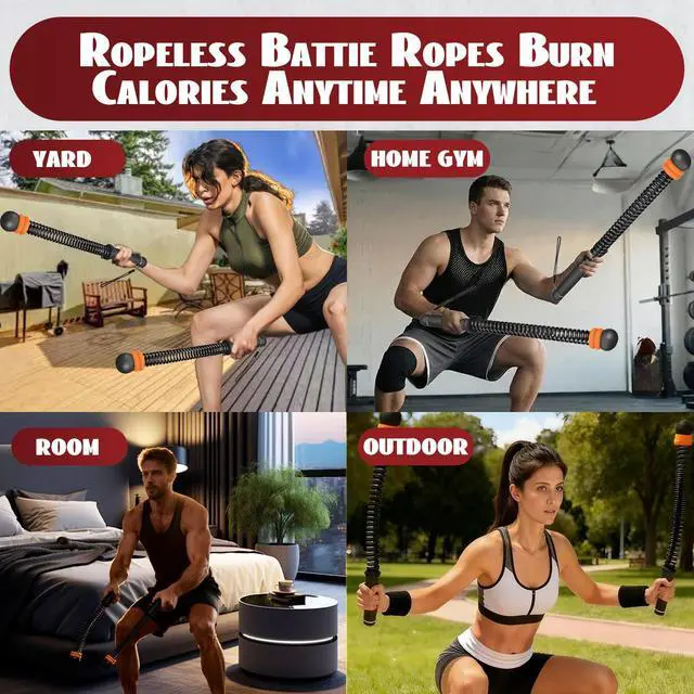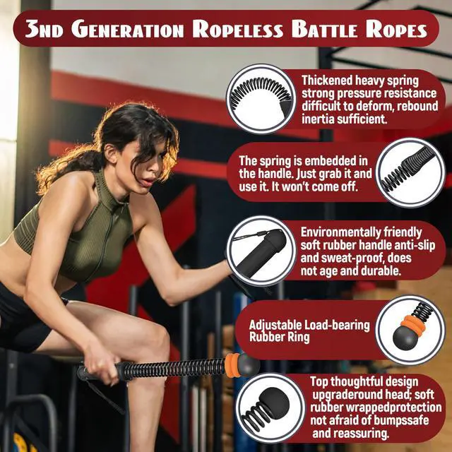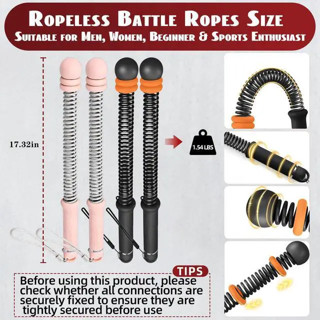 <1>This ropeless battle rope is madeof precision steel material, making the product more durable. Each battle ropeweighs 1.54 lb, which protects your wrists during exercise and allows you tobetter feel the weight of the rope during exercise, thereby bringing a betterexercise experience and effective exercise results. The exercise rope iscompact, easy to carry and store. It is a workout rope for use in home gyms andoutdoor training. <2>Our upgraded ropeless battle ropehandle is made of rubber and has sweat-absorbing and anti-slip functions. Thehandle is ergonomically designed to fit the palm of your hand, making it morecomfortable to use and providing better protection for your wrists. The handleof the exercise rope is installed with a screw thread for a tighter fit, so itwill not loosen or fall off during exercise, and will not add noise to thehandle that affects the user experience. <3> Use this ropeless battle rope toexercise your arms, chest, back, shoulders, and other muscles with differentexercise positions. This exercise rope is suitable for aerobic exercise, HIIT,strength training, and other training programs. A short 20-minute workout withthe exercise rope can quickly burn nearly 200 calories. This workout ropes forhome gym can replace traditional inefficient exercise methods with a moreefficient exercise method. <4> These ropeless battle ropes comewith detailed instructions and training posters to prevent blind training thatcan cause wrist pain, helping users achieve the desired training results. Theexercise ropes are equipped with safety ropes and top nuts to prevent injuryduring use, making them suitable for different groups of people and a must-havefor home gyms. <5> Our ropeless battle ropes areready to use at any time.