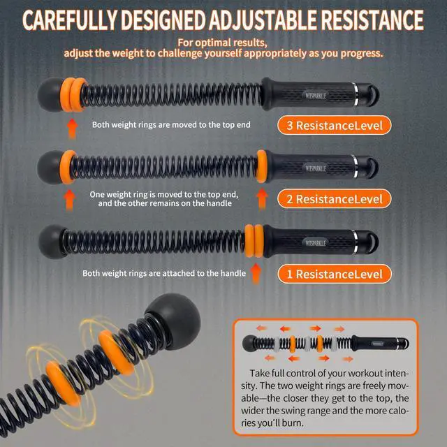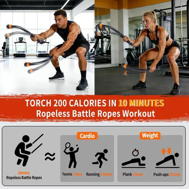 CORDLESS BATTLE ROPES WITH CUSTOM RESISTANCEThese cordless battle ropes with resistance springs let you control workout intensity with easeslide the weight rings closer to the handle for lighter sessions or position them higher for maximum resistance. Ideal for men and women, these weighted ropeless battle ropes grow with your fitness level and training progress.