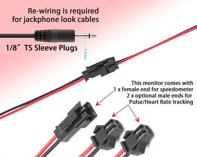 Optional Heart Rate Monitoring Feature: An optional feature that works with bikes with pulse sensors (usually 2 x metal pieces on handle bars). Re-wiring MIGHT be required for some perticular models. 2 x AAA Batteries Not Included - Required: Batteries are NOT included per Amazon Dangerous goods (hazmat) guideline 3 x 2-PIN CONNECTIONBoth speedometer & pulse trakcing connection are. DO NOT WORK ON 3.5 MM HEAD-PHONE LOOK CABLES CompatiblityMost Exercise Spin Bikes use this monitor: - for Stationary Bikes with ''head phone jack'' look connection tips. E.g. bikes by Sunny, PooBoo, L-Now, Snode, Exerpeutic, Pleny, Yosuda, Ativafit,
