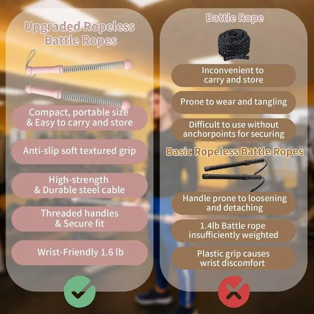 No Rope, No Limits & Full-Body HIIT : Get the same calorie-blasting, muscle-building motion as traditional battle ropeswithout needing a large workout space. Perfect for HIIT, cardio, core and shoulder conditioning.