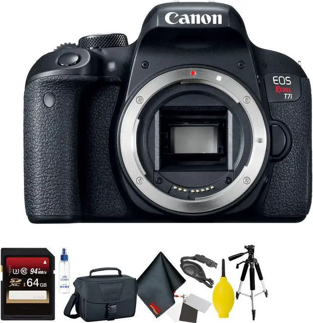 In The Box: Canon EOS Rebel T7i DSLR Camera (Body Only) LP-E17 Lithium-Ion Battery Pack LC-E17 Charger for LP-E17 Battery Pack Eyecup Ef for Digital Rebel Cameras Body CapEW-400D Wide Strap Limited 1-Year Warranty Items Included With Your Purchase: 1 x 64GB Memory Card1 x SD Card Reader1 x Fibercloth1 x Camera Cleaning Kit1 x Memory Card Wallet1 X Lens Cap Keeper1 x Tripod1 x Dust Blower1 x Handstrap1 x Set of White Balance CardsSpecial 2 Year Warranty Covering Accidents, Parts, and Labor