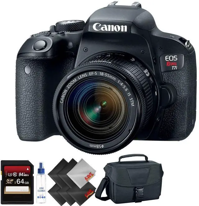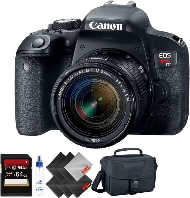 In The Box: Canon EOS Rebel T7i DSLR Camera with 18-55mm LensEF-S 18-55mm f/4- 5.6 IS STM LensLP-E17 Lithium-Ion Battery PackLC-E17 Charger for LP-E17 Battery PackEyecup Ef for Digital Rebel CamerasRF-3 Body Cap for Canon EOS CamerasEW-400D Wide StrapLimited 1-Year