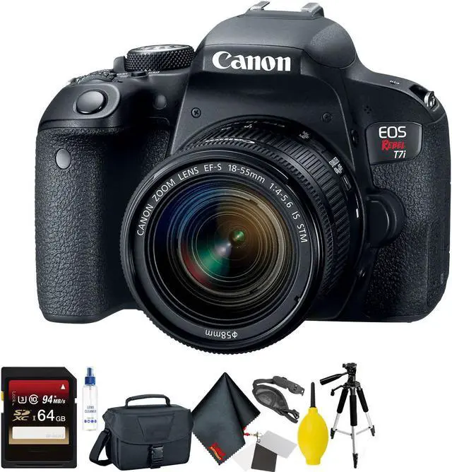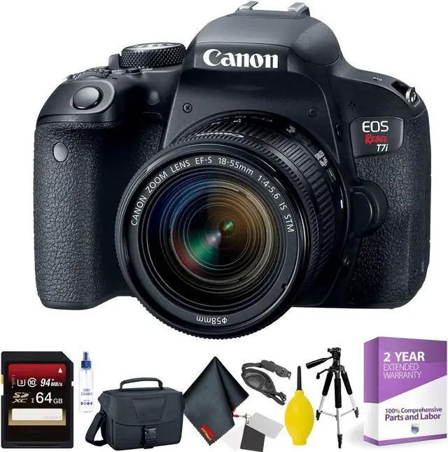 In The Box: Canon EOS Rebel T7i DSLR Camera with 18-55mm Lens EF-S 18-55mm f/4- 5.6 IS STM Lens LP-E17 Lithium-Ion Battery Pack LC-E17 Charger for LP-E17 Battery Pack Eyecup Ef for Digital Rebel Cameras Body CapEW-400D Wide Strap Limited 1-Year Warranty Items Included With Your Purchase: 1 x 64GB Memory Card1 x SD Card Reader1 x Fibercloth1 x Camera Cleaning Kit1 x Memory Card Wallet1 X Lens Cap Keeper1 x Tripod1 x Dust Blower1 x Handstrap1 x Set of White Balance Cards