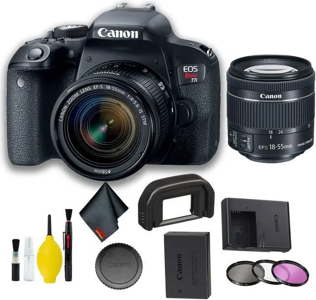 Packing a versatile feature-set in a sleek and portable body, the EOS Rebel T7i DSLR from Canon offers advanced imaging capabilities along with a convenient range of controls and connectivity. Utilizing a 24.2MP APS-C CMOS sensor and DIGIC 7 image processor, the Rebel T7i is able to capture high-resolution stills and video with an expanded sensitivity range of ISO 100-51200 to suit working in a wide variety of lighting conditions. The sensor and processor combination also avails 6 fps continuous shooting for working with moving subjects. Benefitting the imaging attributes, the sensor's design also facilitates Dual Pixel CMOS AF, which uses phase-detection autofocus for quick, accurate, and smooth focusing performance when recording movies or shooting stills in live view. When shooting stills using the optical viewfinder, a 45-point all cross-type phase-detection system is used for quick and accurate focusing in a variety of shooting scenarios.