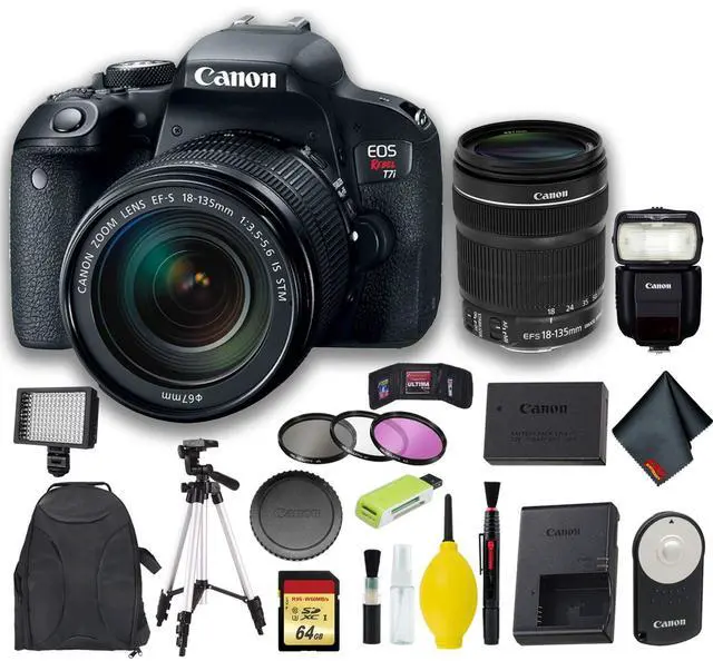 Bundle Items Include: Canon EOS Rebel T7i DSLR CameraEF-S 18-135mm f/ 3.5 - 5.6 IS STM LensLP-E17 Lithium-Ion Battery PackLC-E17 Charger for LP-E17 Battery PackEyecup EFRF-3 Body Cap for Canon EOS CamerasEW-400D Wide StrapMicrofiber ClothLens Cleaning Kit3-Piece Filter KitBackpack Carry CaseFull Size TripodWireless Remote ControlLED Video Light64GB MemoryMemory Card WalletUSB Card ReaderCanon 430 EX III RT Flash