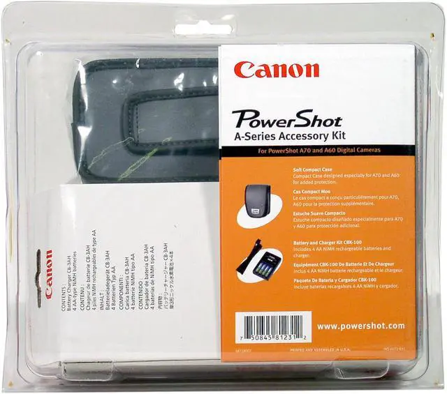 Features Keep your camera in action with the Canon A-series accessory kit. The deluxe, compact case protects your camera everywhere you want to go. You will always have a fresh set of batteries with the battery and charger kit, which contains a AA-type NiMH battery charger, AC cable, and 4 AA-type NiMH rechargeable batteries.