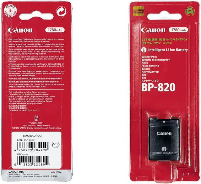 This Canon BP-820 Lithium-Ion Single Battery Pack uses lithium-ion chemistry and has a capacity of 1780mAh with a voltage of 7.4 VDC. The battery is designed to resist memory effect, so it continues to last just as long between charges as it did when it was new. This battery comes with retail packaging.