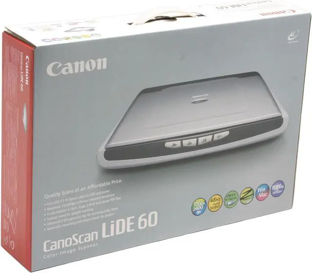 Scanning made simple, the Canon CanoScan LiDE 60 is an attractive, easy-to-use, and compact option for fast color and B&W image and document scans. Four buttons up front tell the LiDE 60 exactly what you want to do: Scan, Copy, Create PDF, and E-mail. Just place the original on the 8.5x11.7-inch scanning surface, hit the button for what you want to do, and in approximately 9 seconds your scan can be previewed on your monitor.