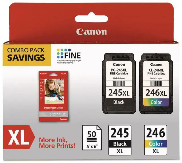 Experience crisp, smudge-resistant professional quality text with the PG-245XL pigment black ink and CL-246XL color cartridge plus the vibrant, glossy paper gives you crisp, clear pictures that are high quality without the high cost--an economical choice for great prints. The ink is designed with FINE (full photolithographic inkjet nozzle engineering) technology. Your documents will realize added sharpness, detail and quality. When printing with genuine Canon inks and photo papers, the ChromaLife100 system gives you beautiful photos and amazing longevity.