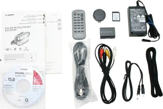 | Package Contents | Elura 80 Camcorder NB-2LH Battery Pack CA-570 Compact Power Adapter STV-250N Stereo Video Cable WL-D85 Wireless Controller MultiMediaCard MMC-16M IFC-300PCU USB Cable SS-900 Shoulder Strap DIGITAL VIDEO SOLUTION DISK for Windows DIGITAL VIDEO SOLUTION DISK for Macintosh |