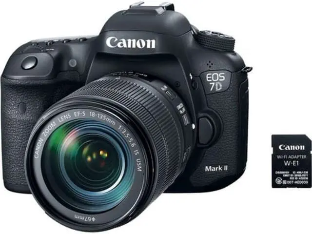 Canon EOS 7D Mark II DSLR Camera with 18-135mm f/ 3.5 - 5.6 IS USM Lens & W-E1 Wi-Fi Adapter offers a blend of stills and video functionalities for optimum performance. It features a 20.2MP APS-C CMOS Sensor, Dual DIGIC 6 Image Processors, 3.0" 1.04 m-Dot ClearView II LCD Monitor, Full HD 1080p/60 Video & Movie Servo AF, Dual Pixel CMOS AF with Live View, 65-Point All Cross-Type Phase-Detect AF, Native ISO 16000, Extended to ISO 51200, 10 fps Shooting at Full Resolution, Wi-Fi via W-E1 Adapter; Built-In GPS, EF-S 18-135mm f/ 3.5 - 5.6 IS USM Lens, among others.