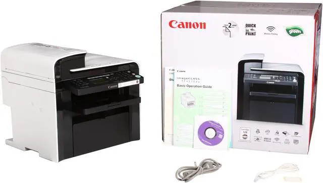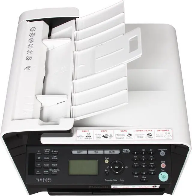 | Features | WiFi Capabilities: Duplex print, scan and PC fax at up to 802.11n speed Duplex Versatility right out of the box - duplex printing plus two-sided copies and received faxes Print and Copy in black & white at up to 26 ppm Quick First Print provides first print time of approximately 6 seconds Efficient energy saving mode; approximately 3.5 W (wired)/4.0W (wireless) Advanced Print Modes include Booklet, Watermark, Toner Saver, Poster and Page Composer Up to 9600 dpi (interpolated) color scanning quality 33.6 Kbps Super G3 fax User-friendly 5-line LCD for easy navigation 250-sheet front-loading paper cassette plus single-sheet multipurpose tray Single Cartridge System for cost-efficient supplies replenishment Canon Generation Green Energy Star Qualified |