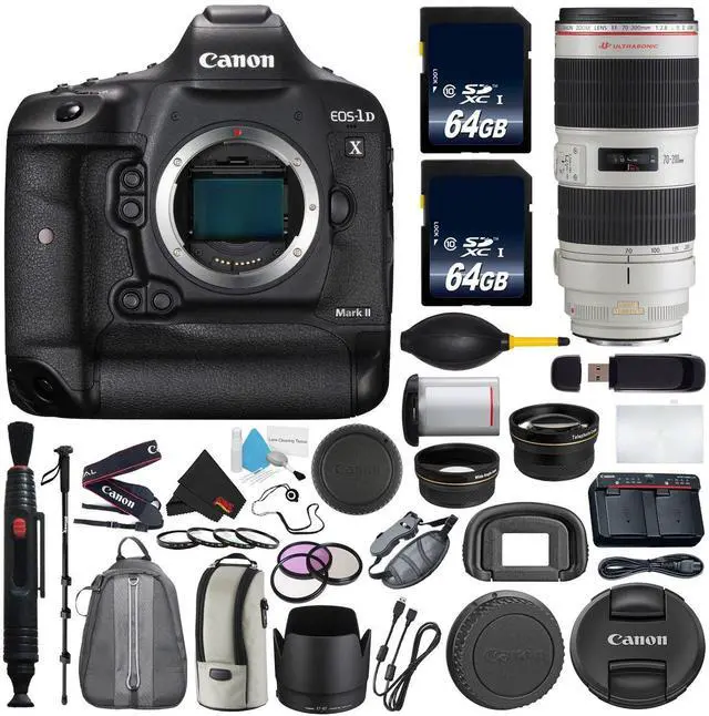 Bundle includes: 1- Canon EOS-1D X Mark II DSLR Camera (Body Only) 1- Canon EF 70-200mm f/ 2.8L IS II USM Lens1- Lens Pen Cleaner1- Lens Cleaning Solution1- Blower Brush1- Microfiber Cloth1- Lens Tissue Paper1- 5pc Cotton Swabs1- High Quality Dust Blower1- MicroFiber Cloth 1- SLR/DSLR Pro Hand Camera Grip2- SanDisk 64GB Extreme PRO SDXC UHS-I Memory Card1- USB SDHC Card Reader1- Lens Cap Keeper (Dont Lose your Caps! ) 1- 70in Monopod1- Deluxe SLR Backpack (Padded Compartments Carry All Your Gear Safely! )1- 77mm 0.45 x Wide Angle Lens w/ Pouch and Caps (Capture That View! ) 1- 77mm 2x Telephoto Lens W/ Pouch and Caps (More Zoom better! )1- 77mm 3 Piece