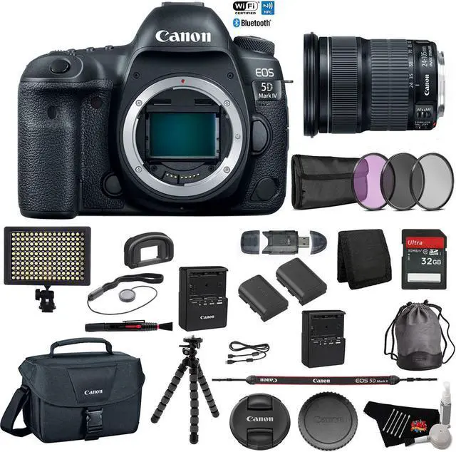 Manufacturer Included Items: Canon EOS 5D Mark IV DSLR Camera (Body Only) LP-E6N Lithium-Ion Battery Pack ( 7.2V, 1865mAh) LC-E6 Charger for LP-E6 Battery Pack Eyecup RF-3 Body Cap for Canon EOS Cameras IFC-150U II USB 3.1 Gen 1 Interface Cable for DSLRs Cable Protector Wide Neck Strap Software CD-ROM