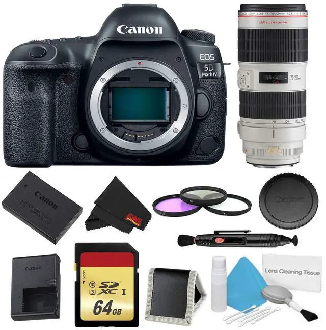 Bundle Items Include: Canon EOS 5D Mark IV DSLR Camera (Body Only) - International ModelCanon 70-200mm 2.8L USM IS II Lens - International ModelLP-E6N Lithium-Ion Battery Pack ( 7.2V, 1865mAh)LC-E6 Charger for LP-E6 Battery PackEyecup EgRF-3 Body Cap for Canon EOS CamerasIFC-150U II USB 3.1 Gen 1 Interface Cable for DSLRsCable ProtectorWide Neck StrapSoftware CD-ROM64GB UHS-I SDXC Memory Card (Class 10) 77mm 3 Piece Filter KitLens Pen Cleaner5 Piece Lens Cleaning KitMemory Card WalletMicrofiber Cloth