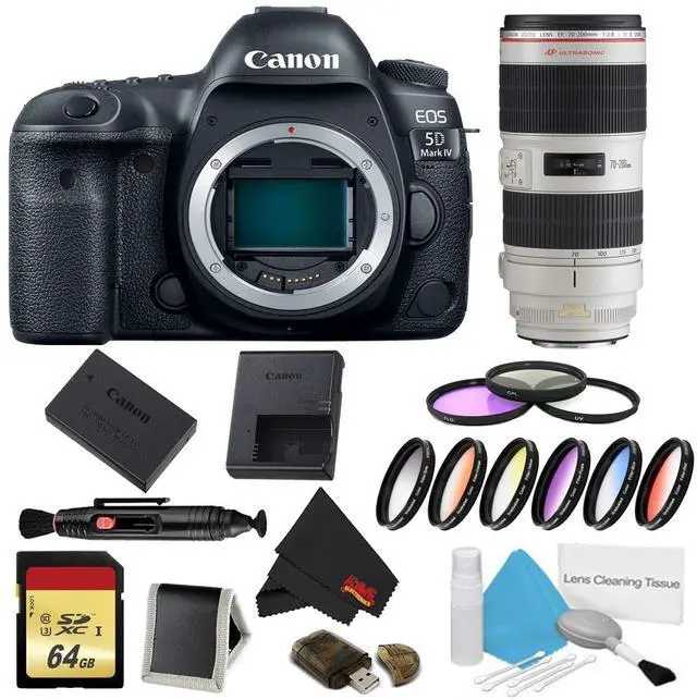 Bundle Items Include: Canon EOS 5D Mark IV DSLR Camera (Body Only) - International ModelCanon 70-200mm 2.8L USM IS II Lens - International ModelLP-E6N Lithium-Ion Battery Pack ( 7.2V, 1865mAh)LC-E6 Charger for LP-E6 Battery PackEyecup EgRF-3 Body Cap for Canon EOS CamerasIFC-150U II USB 3.1 Gen 1 Interface Cable for DSLRsCable ProtectorWide Neck StrapSoftware CD-ROM64GB UHS-I SDXC Memory Card (Class 10) 77mm Graduated Color Multicoated 6pcs Filter Set77mm 3 Piece Filter KitLens Pen Cleaner5 Piece Lens Cleaning KitUSB Card ReaderMemory Card WalletMicrofiber Cloth