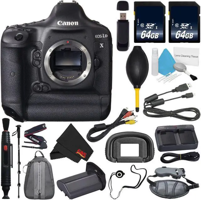 Bundle includes: Canon EOS-1D X DSLR Camera (Body Only) 1- Lens Pen Cleaner1- Lens Cleaning Solution1- Blower Brush1- Microfiber Cloth1- Lens Tissue Paper1- 5pc Cotton Swabs1- High Quality Dust Blower1- MicroFiber Cloth 1- SLR/DSLR Pro Hand Camera Grip2- SanDisk 64GB Extreme PRO SDXC UHS-I Memory Card1- USB SDHC Card Reader1- Lens Cap Keeper (Dont Lose your Caps! ) 1- 70in Monopod1- Deluxe SLR Backpack (Padded Compartments Carry All Your Gear Safely! )