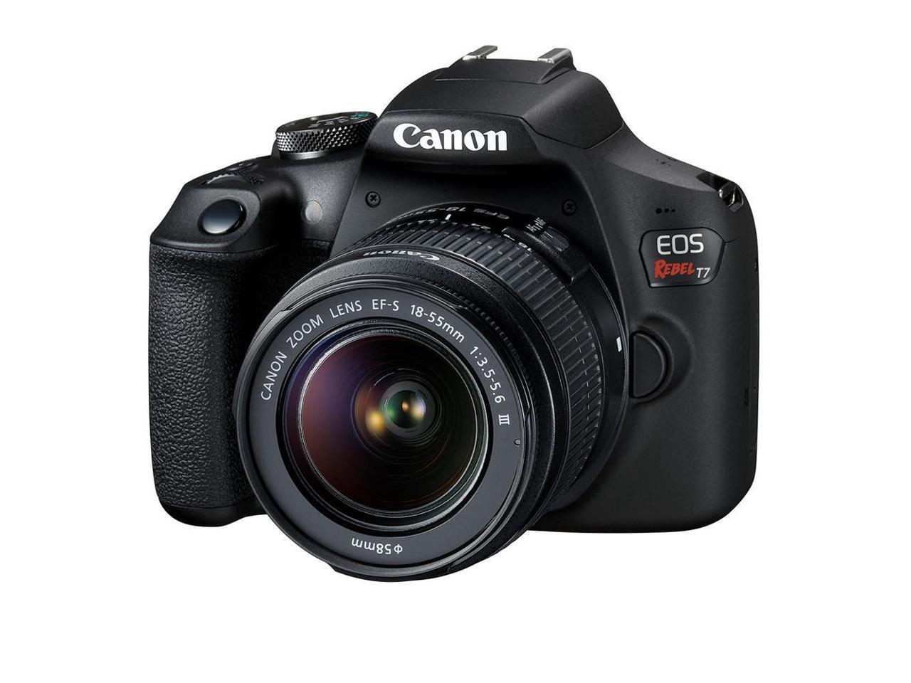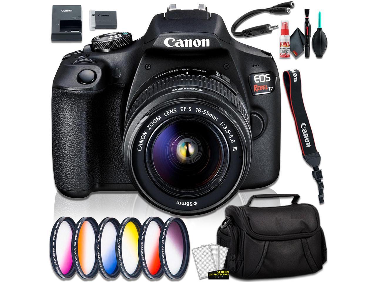 - 24.1MP APS-C CMOS Sensor | DIGIC 4+ Image Processor | 3.0" 920k-Dot LCD Monitor. Full HD 1080/30p Video Recording | 9-Point AF with Center Cross-Type Point. ISO 100-6400, Up to 3 fps Shooting | Built-In Wi-Fi with NFC. EF-S 18-55mm Lens: Provides a 28.8-88mm equivalent focal length range that covers wide-angle to short telephoto perspectives.. 1 x Canon EOS Rebel T7 DSLR | 1 x Camera Bag | 1 x Vivitar 58mm Graduated Color Filter Kit | 1 x Hosa Y Cable | 1 x Cleaning Kit