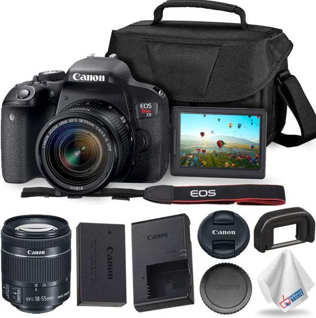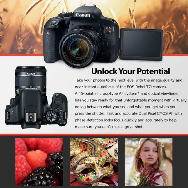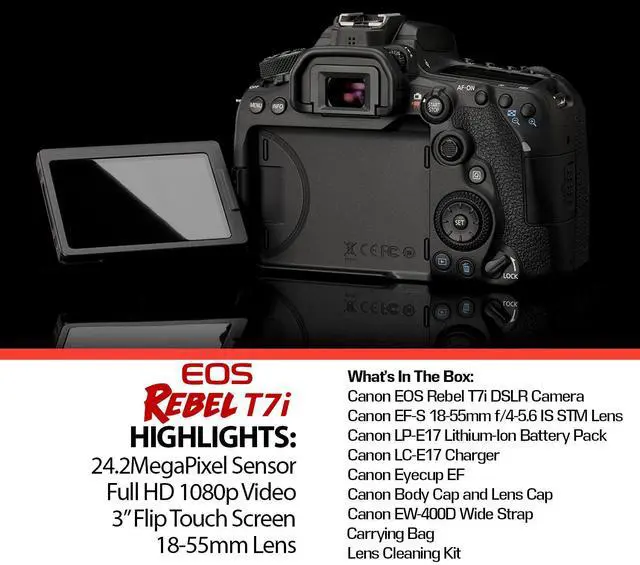 Canon EOS Rebel T7i DSLR Camera with 18-55mm Lens Overview:The first step in Canon's mirrorless evolution, the EOS R pairs a redeveloped lens mount and updated full-frame image sensor for a unique and sophisticated multimedia camera system. Revolving around the new RF lens mount, the EOS R is poised to be the means from which to make the most of a new series of lenses and optical technologies. Beyond the performance attributes, this camera has been designed from the ground up and features a high-resolution 3.69m-dot OLED electronic viewfinder for clear and bright eye-level viewing. Conversely, a rear 3.15" 2.1m-dot LCD touchscreen is also featured, and has a swivel design to suit working from high and low angles. Also catering to the tactile cravings is a Multi-Function bar, which is customizable for intuitively adjusting shooting settings. And as a camera built to withstand the toughest environments, the magnesium alloy body is dust and moisture-sealed. 24.2MP APS-C CMOS Sensor DIGIC 7 Image Processor 3.0" 1.04m-Dot Vari-Angle Touchscreen Full HD 1080p Video Recording at 60 fps 45-Point All Cross-Type Phase-Detect AF Dual Pixel CMOS AF Up to 6 fps Shooting and ISO 51200 Built-In Wi-Fi with NFC, Bluetooth