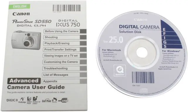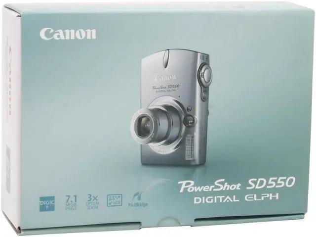 | Package Contents | PowerShot SD550 Body Lithium Battery Pack NB-3L Battery Charger CB-2LU SD Memory Card SDC-32M Wrist Strap WS-700 Digital Camera Solution CD-ROM USB Interface Cable IFC-400PCU Audio/Video Cable AVC-DC300 |