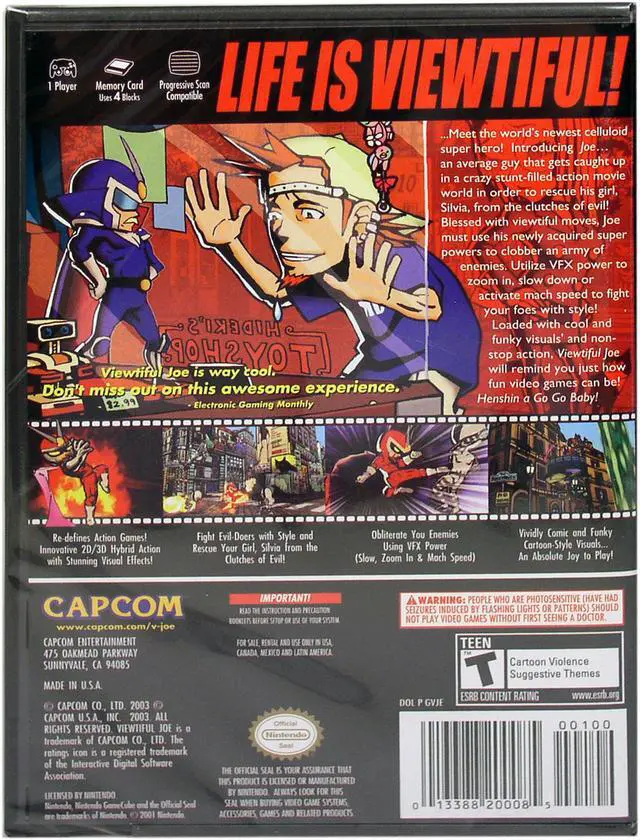 | Features | Welcome to the world of Viewtiful Joe! Capcom's innovative super hero action game that mixes funky cartoon-style visuals with classic side-scrolling gameplay and introduces the world's quirkiest million dollar action hero... Joe! More than just any ordinary dude, Joe must transform into the ultimate superhero. It's up to you to activate the correct view mode like Slow or Zoom In in order to clobber your enemies with beautiful style! You can also speed up or slow down your visual effects for even more viewtiful moves. |