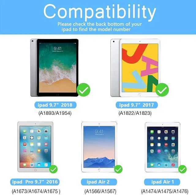 Compatibility: Specifically designed for iPad 9.7 -inch (5th/6th Gen 2017/2018 A1822/A1823/A1893/A1954) iPad Air 1/2 (2013/2014 A1474/A1475/A1476/A1566/A1567) and iPad Pro 9.7 -inch (2016 A1673/A1674/A1675). Precise cutouts wont block cameras sensors or Face ID ensuring full compatibility with your device.