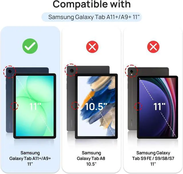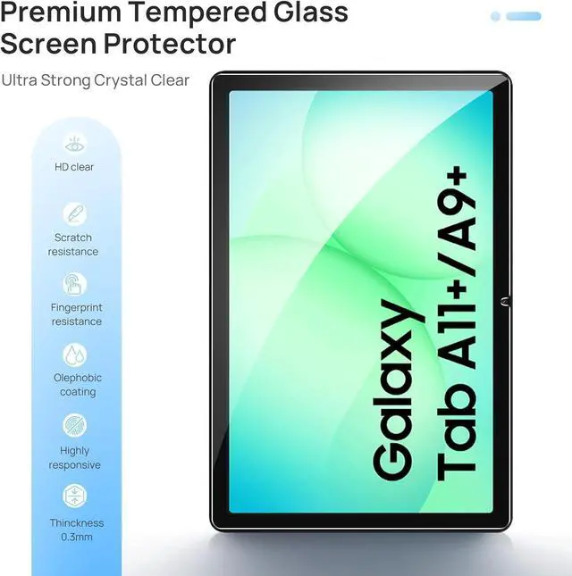 [Compatible Model] Screen protector tempered glass for Galaxy Tab A11 Plus/A11+ 11 inch 2025 (Model: SM-X230/SM-X235/SM-X236B); Galaxy Tab A9 Plus/A9+ 11 inch 2023 (Model: SM-X210/SM-X216/SM-X218) Not fit for other models. [9H Hardness] 9H hardness tempered glass screen protector is 3 times stronger than other film offers Maximum protection your tablet from high impact drops and accidental scratch. [High Definition] 99.9 % high light transmittance keep the natural viewing experience oleo-phobic coating layer offers Fingerprint proof and dirt-proof. [High Sensitivity] Only 0.3 mm thickness full compatible with 3D Touch faster responding and the original touch feeling. [Easy Installation] Bubble-free by installation kit Clean the screen and press the screen tempered film the small bubbles left will disappear automatically.