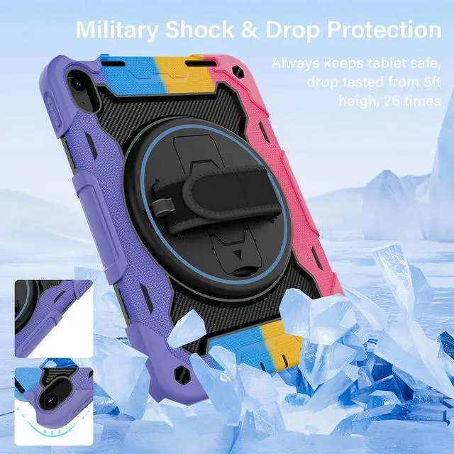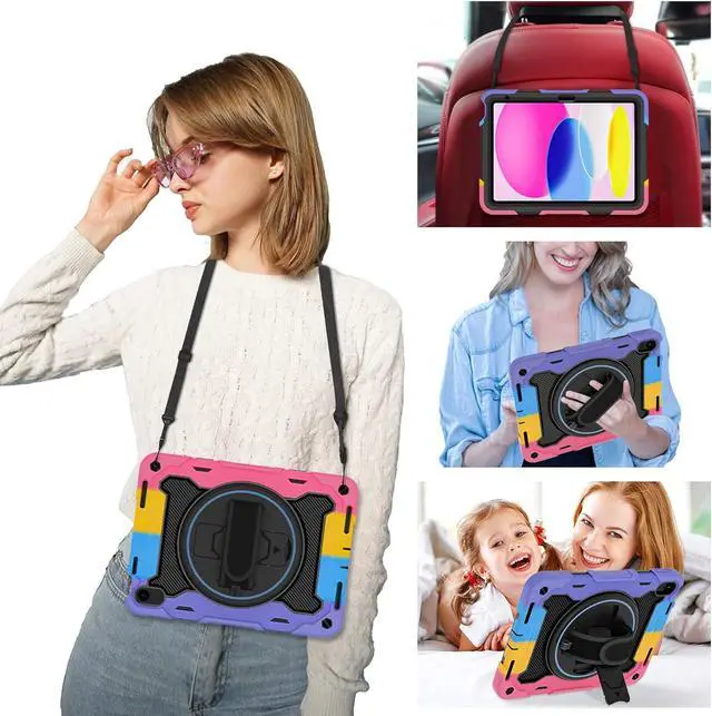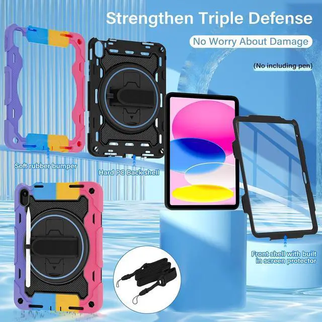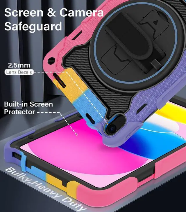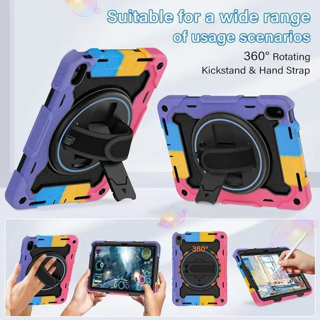 Generation 10.9 inch (Model includes: A3354/A3355/A3356 A2696/A2757/A2777) 2025/2022 Released[Unique Kickstand Function] only one type of iPad (A16) 10th/11th Case full body rugged protective durable rubber case supports auto kickstand retraction in the market you only need to lift the kickstand up gently and then free your hand done to open/close the kickstand that allows you and your kids use it much convenience. There is a Stylus Pen Holder on the back to store your pen (Pencil is NOT included) [3-layer Super Thick Full Body Strong Protection] Upgrade super thick super soft rubber + rugged PC and front screen protector frame combination. Not only increase ten times shockproof impact resistance but also increase extra dissipate heat by upgrade built in soft endothermic sponge[360 Rotating Kickstand / Hand Strap] Multiple angles kickstand and hand strap suit for all kinds of group such as toddler / children / kids make money people at office/restaurant / school / warehouse / outside students at elementary school /middle school/ high school /university senior people at home and another people[Built-in Screen Protector+Detachable Shoulder Strap] Raised edges on the screen protection + have built in screen protector protection truly made work to protect screen of iPad from scratching and breaking.