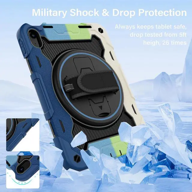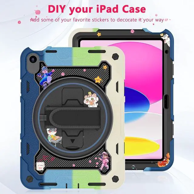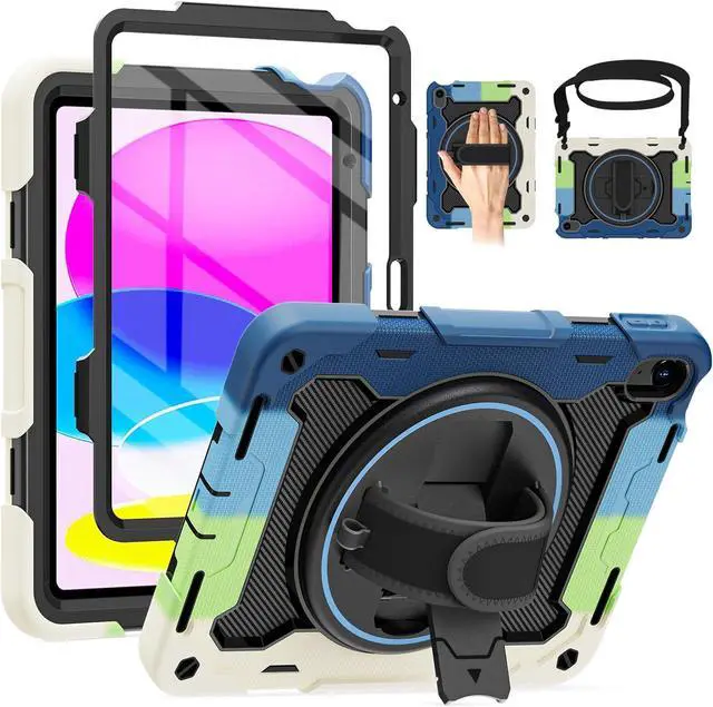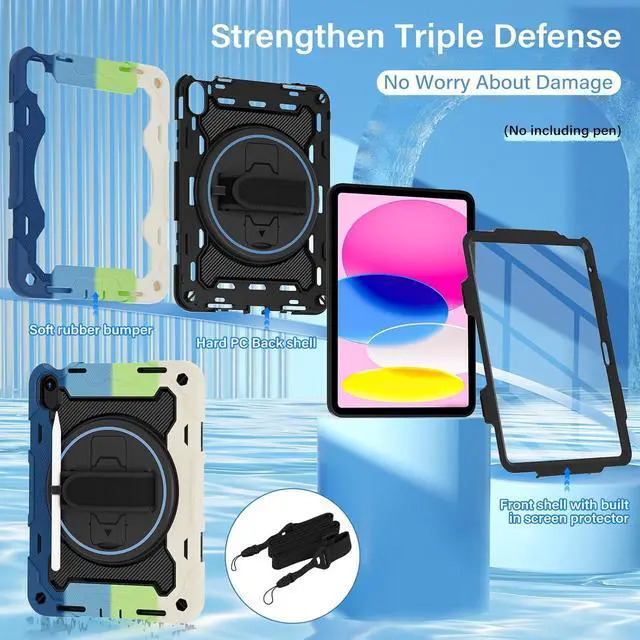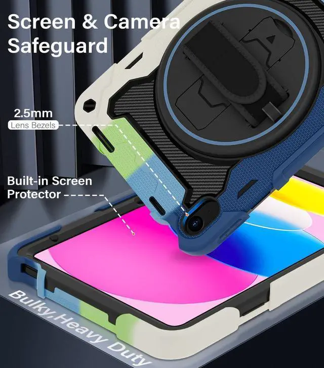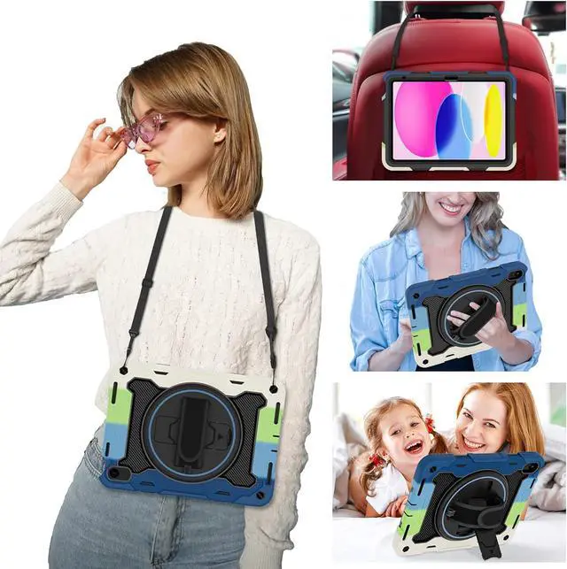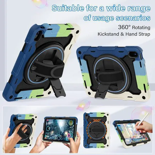 Generation 10.9 inch (Model includes: A3354/A3355/A3356 A2696/A2757/A2777) 2025/2022 Released[Unique Kickstand Function] only one type of iPad (A16) 10th/11th Case full body rugged protective durable rubber case supports auto kickstand retraction in the market you only need to lift the kickstand up gently and then free your hand done to open/close the kickstand that allows you and your kids use it much convenience. There is a Stylus Pen Holder on the back to store your pen (Pencil is NOT included) [3-layer Super Thick Full Body Strong Protection] Upgrade super thick super soft rubber + rugged PC and front screen protector frame combination. Not only increase ten times shockproof impact resistance but also increase extra dissipate heat by upgrade built in soft endothermic sponge[360 Rotating Kickstand / Hand Strap] Multiple angles kickstand and hand strap suit for all kinds of group such as toddler / children / kids make money people at office/restaurant / school / warehouse / outside students at elementary school /middle school/ high school /university senior people at home and another people[Built-in Screen Protector+Detachable Shoulder Strap] Raised edges on the screen protection + have built in screen protector protection truly made work to protect screen of iPad from scratching and breaking.