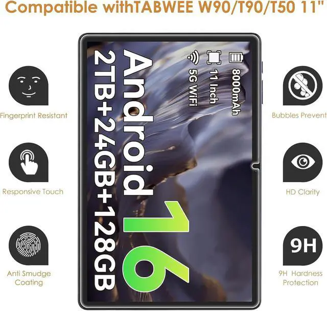 2-Pack Screen Protector Compatible with TABWEE T50/ W90/ T90 11Tempered glass film provides a safe guard to your liquid crystal screen with protective premium paper package including two sets of cleaning kits intimate care with two-pack.