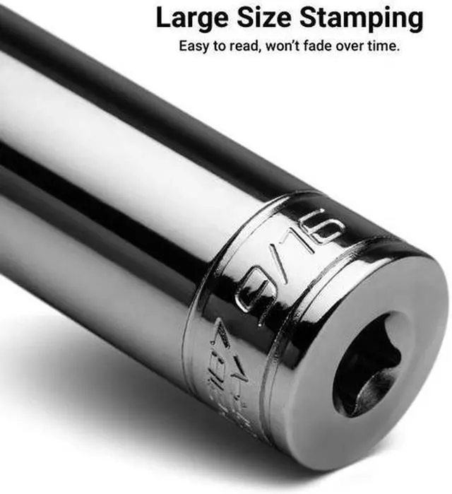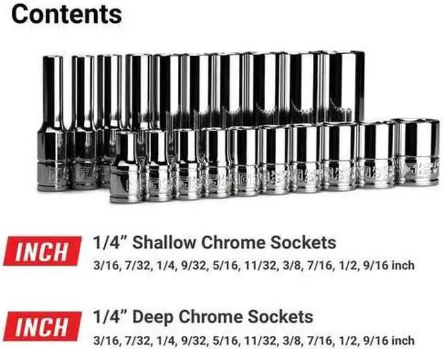 drive 6-point deep sockets: 3/16, 7/32, 1/4, 9/32, 5/16, 11/32, 3/8, 7/16, 1/2, 9/16 in., (10) 1/4 in.