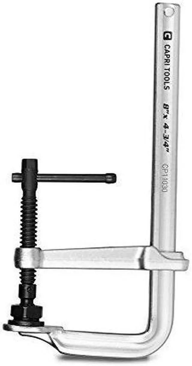 California Proposition 65: This product contains a chemical known to the State of California to cause birth defects or other reproductive harm. The Capri Tools 8-Inch Heavy Duty All Steel Bar Clamp is engineered and constructed for heavy duty applications. The f style bar clamp is entirely made with premium steel. Each component - jaws, rail, spindle, and handle - is expertly forged and heat treated. It is engineered to perform and made to last. The steel surfaces are thoroughly nickel and chrome plated for corrosion resistance. It is equipped with hardened steel T bar handle, letting you apply and release clamping pressure easily and surely. Precisely machined spindle ensures smooth operation. The spindle also features a 5/8 in. hex end which lets you use a wrench or ratchet wrench for fast tightening and untightening. Heavy duty swivel pad applies even pressure to work pieces of different shapes. This Capri Tools Bar Clamp has an 8 in. clamping capacity, 4-3/4 in. throat depth, and 2, 204 lbs of clamping force.