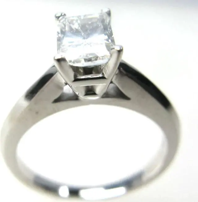 This ring is a winner! She will love this Radiant shaped Diamond, set in 14k White Gold. The size of the ring is 5.5, although it can be resized for free from size 4 to 9. We will contact you within 24 hours of purchase by email and ask for your ring size. The carat weight of the diamond is 1.02. The color of the diamond is J and the clarity is SI1. The measurements of the diamond are: 6.17X 4.99X 3.78. This stone is certified by GIA, cert