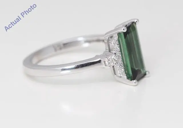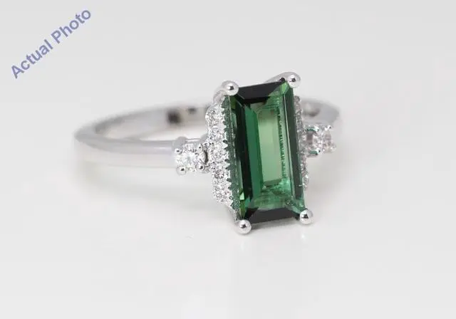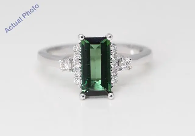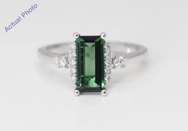 The weight of the metal in this ring is 3.54 grams (approx). In the center of this ring there is a beautiful earth mined tourmaline. This emerald shaped tourmaline is 1.42 carats in weight, is green in color, and has a clarity grade of VS2. This tourmaline is possibly heated to enhance its color or clarity. This ring has 12 earth mined diamonds set to accent the center of this beautiful piece. These round shaped diamonds are 0.18 carats in weight, has a color grade of H, and have a clarity grade of VS2.