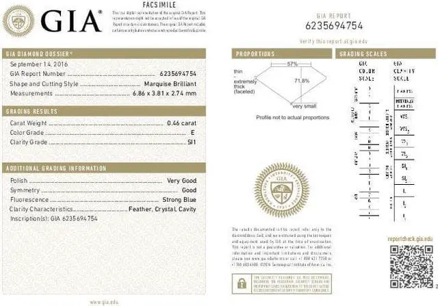 This loose diamond is a winner! She will love this Marquise shaped loose diamond. The carat weight of the diamond is 0.46. The color of the diamond is E and the clarity is SI1. The measurements of the diamond are: 6.86X 3.81X 2.74. This stone is certified by GIA, cert