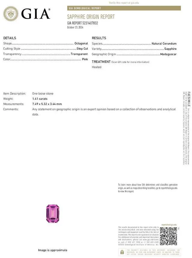Sapphire in mm are: 7.49 x 5.32 x 3.44. Gemological Opinion on Origin Yes, as determined through expert gemological analysis; please refer to the accompanying certification for full details. This stone is certified by GIA, cert