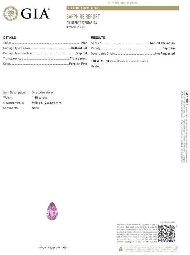 This loose Sapphire is a winner! She will love this natural earth mined Pear shaped loose Sapphire. The carat weight of the Sapphire is 1.85. The color of the Sapphire is Purplish Pink(Heat-Treated) and the clarity is VS2. The measurements of the