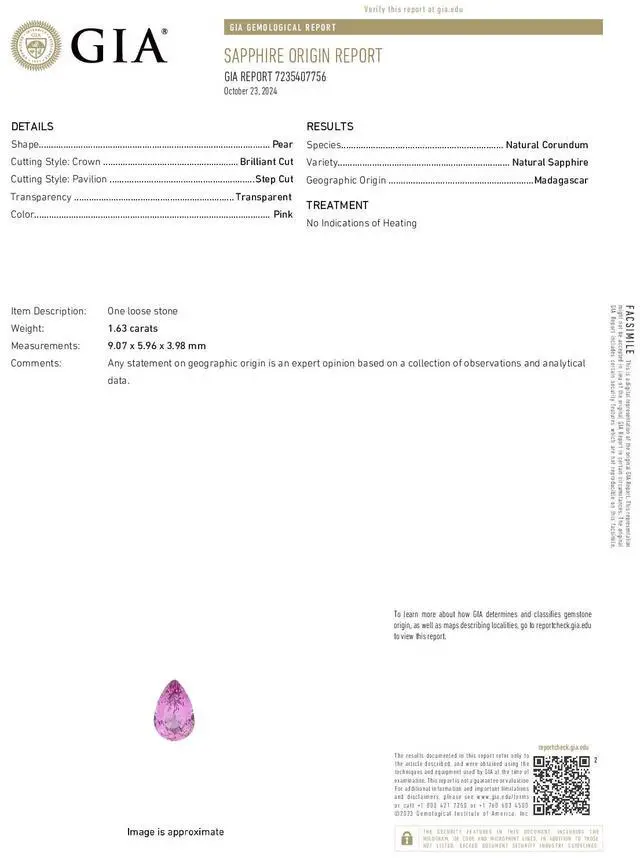 Sapphire in mm are: 9.07 x 5.96 x 3.98. Gemological Opinion on Origin Yes, as determined through expert gemological analysis; please refer to the accompanying certification for full details. This stone is certified by GIA, cert