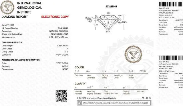 This ring is a winner! She will love this Round shaped diamond, set in 14k White Gold. The size of the ring is 5, although it can be resized for free from size 4 to 9. To resize the ring, please contact us at the time of purchase, otherwise we will send the ring in its current size. The carat weight of the diamond is 0.93. The color of the diamond is F and the clarity is SI2. The measurements of the diamond in mm are: The weight in grams is approximately 0 6.32 x 6.37 x 3.76. This stone is certified by IGI, cert