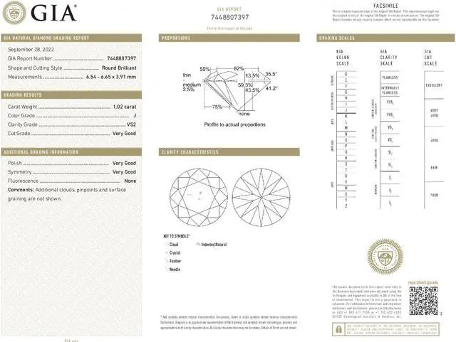 #: 7448807397. The cut grade of the diamond is very good. The polish is Very Good with Very Good symmetry. The depth is 59.3 % with a table width of 62%.
