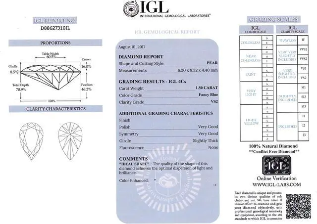 This loose diamond is a winner! She will love this Pear shaped loose diamond. The carat weight of the diamond is 1.5. The color of the diamond is Fancy Blue (Irradiated) and the clarity is VS2. The measurements of the diamond in mm are: 6.20 x 8.32 x 4.40. This stone is certified by IGL, cert
