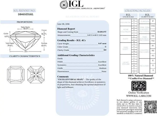 This loose diamond is a winner! She will love this Radiant shaped loose diamond. The carat weight of the diamond is 0.47. The color of the diamond is G and the clarity is SI3. The measurements of the diamond are: 3.82X 4.68X 3.03. This stone is certified by IGL, cert