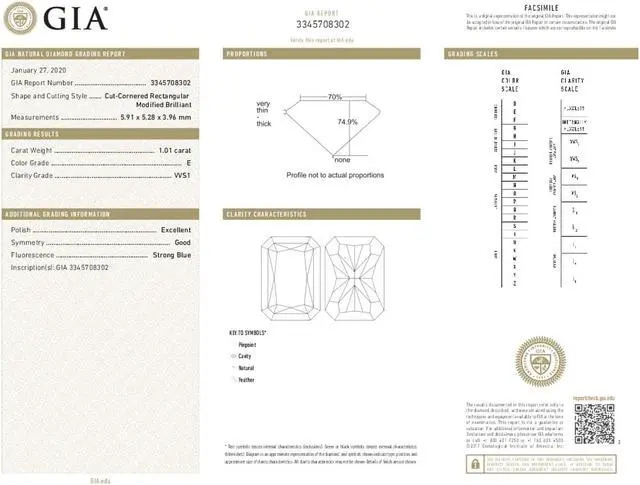 #: 3345708302. The polish is Excellent with Good symmetry. The depth is 74.9 % with a table width of 70%. This diamond has Strong fluorescence and a fluorescent color of Blue. This diamond is accompanied by its own certificate, which attests to its authenticity as well as its grading. All our diamond jewelry and loose diamonds arrive in a classic jewelry box and come with a 30-day return policy.