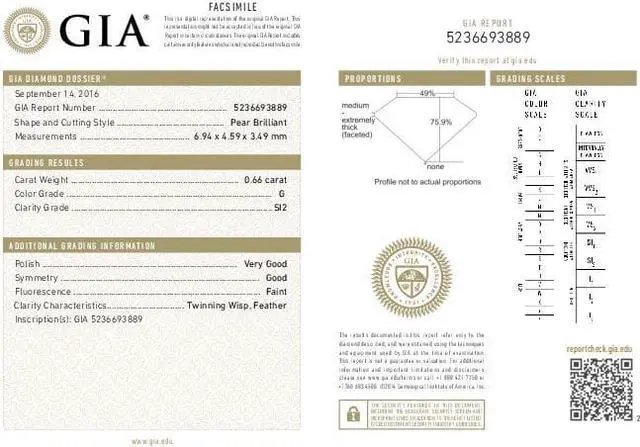 This loose diamond is a winner! She will love this Pear shaped loose diamond. The carat weight of the diamond is 0.66. The color of the diamond is G and the clarity is SI2. The measurements of the diamond are: 6.94X 4.59X 3.49. This stone is certified by GIA, cert