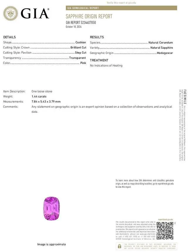 Sapphire in mm are: 7.84 x 5.43 x 3.79. Gemological Opinion on Origin Yes, as determined through expert gemological analysis; please refer to the accompanying certification for full details. This stone is certified by GIA, cert